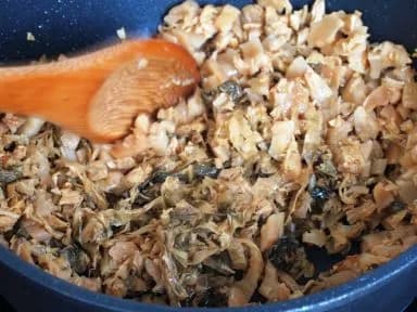 烧热锅,放少许油,下入大片的葱姜煸炒,炒出香味后放入泡发的梅菜继续翻炒。加入少许的盐和糖等调味,翻炒均匀盛入碗中,挑出姜葱。