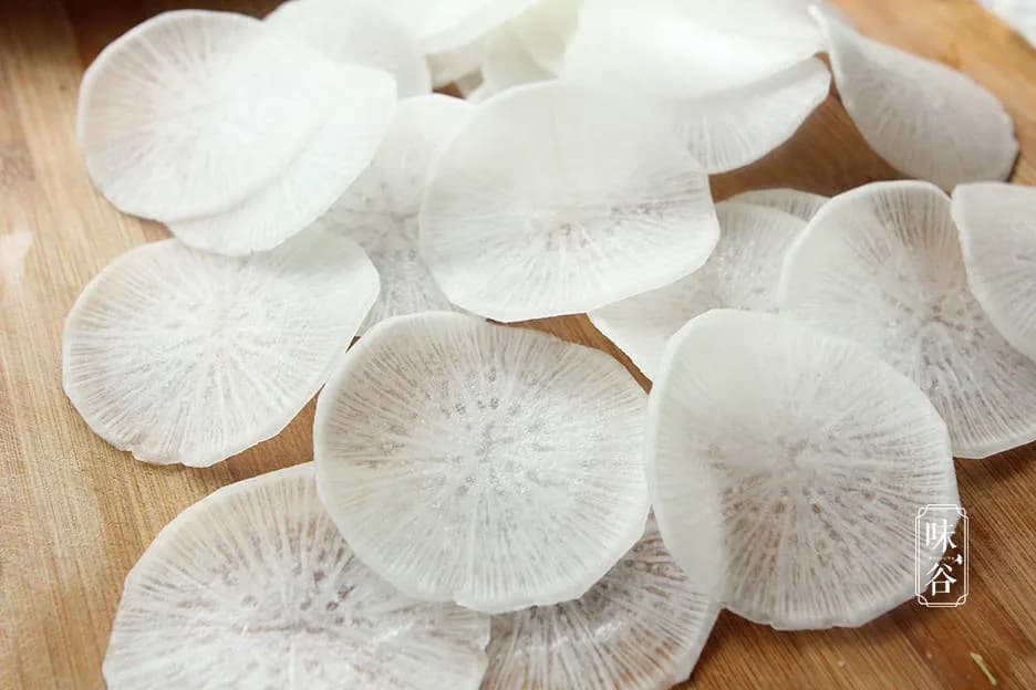 白萝卜去皮切薄片,起锅烧开水,放入白萝卜烫软,约2分钟即可,不需要太久。