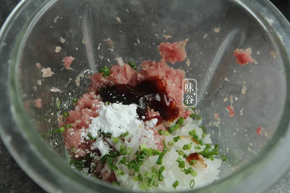 猪前腿肉剁成肉馅,加入料酒、食盐、白糖,蚝油、淀粉、葱花和萝卜碎,用筷子顺方向使劲搅拌,腌制20分钟。