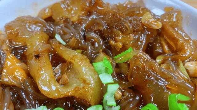 准备一些小葱清洗干净,切成小葱末,撒在炖好的牛蹄筋上,翻拌一下,盛入大盘内,完成。