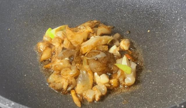 锅中放入适量食用油,把葱姜、蒜、八角、花椒粒同时倒入热油锅中,炒出香味,再把牛蹄筋倒入锅中,先大火不停翻炒几下,把里面的水分炒出来后,再倒入少许酱油、1勺味极鲜、盐和料酒,不停的翻炒,炒至上色。
