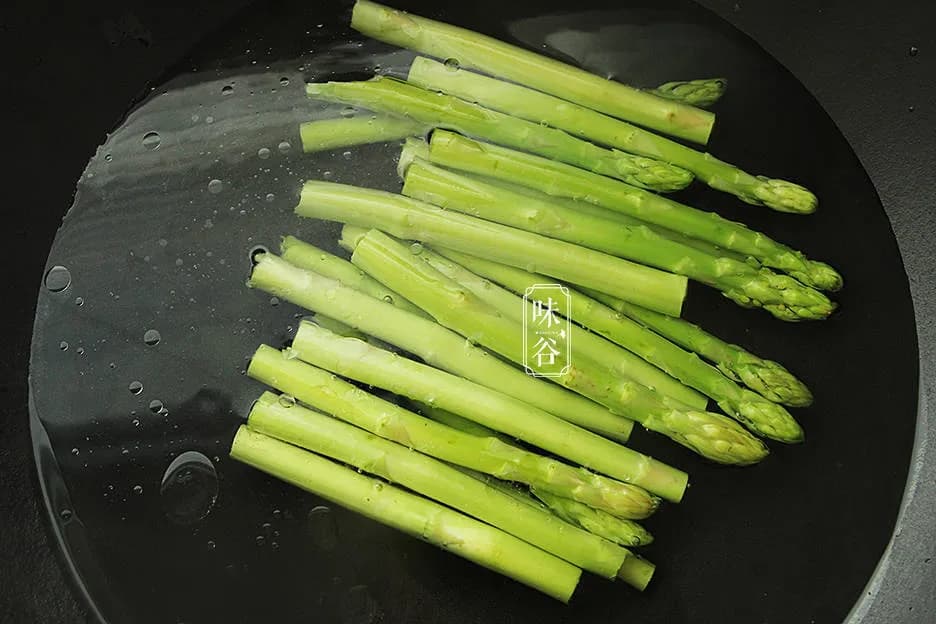 芦笋洗干净,芦笋切去老根,然后一分为二切断,锅里烧水,然后放点盐、滴几滴油(这样焯出来的芦笋色泽会鲜艳),水开后放入芦笋煮至变色,断生即可,捞出过凉水,摆盘。