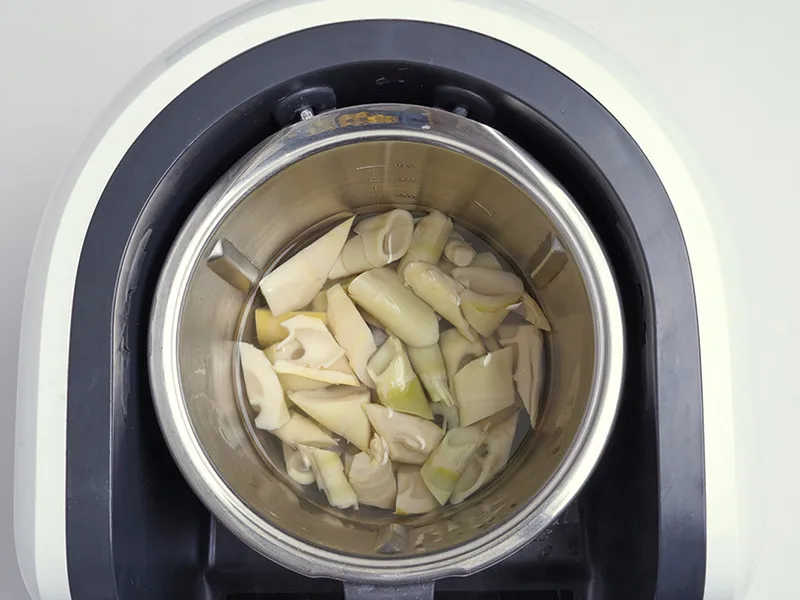 将笋块放入砂锅中,加入火腿骨和高汤,旺火烧开后转小火炖15分钟,笋熟味出时离火待用;