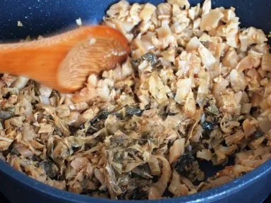 烧热锅,放少许油,下入大片的葱姜煸炒,炒出香味后放入泡发的梅菜继续翻炒。加入少许的盐和糖等调味,翻炒均匀盛入碗中,挑出姜葱。