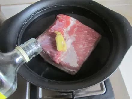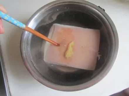 将正正方方的肥瘦相间的五花肉块放入冷水中,加入2-3片姜片和适量白酒。