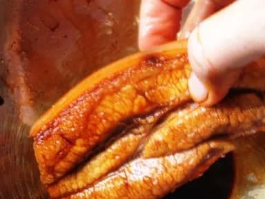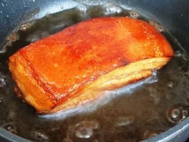 凉后在厨房纸巾上控干水分,烧热锅,放入适量的油,将五花肉肉皮向下放入里面去炸至每面金黄
