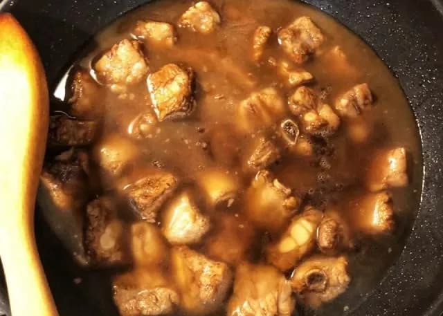 当排骨入味的时候,把白糖、醋、葱段丟进去,再收,直到汤变浓稠时,下水豆粉,把滋汁再收浓稠一些这个菜就做成了。