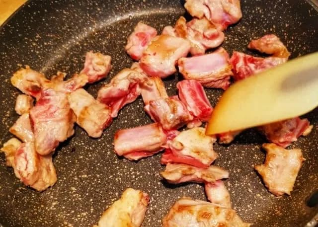 炒锅置旺火上,下菜油,这里一般用的是熟莱油,现在市场上卖的调和色拉油,都是熟油。当油烧至六成热时,下排骨,煸干水汽。