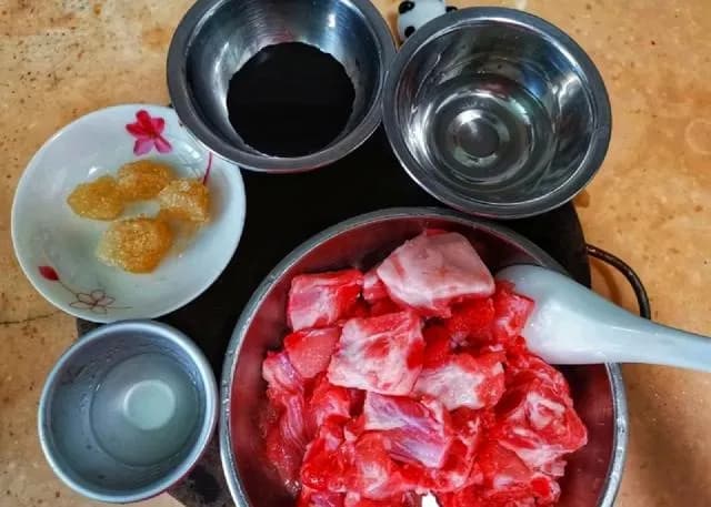 这里讲的是家庭的做法,用了泡辣椒和水豆粉。加水豆粉的目的是为了使滋汁更加浓稠,更加巴味。加泡辣椒,是为了取一点泡辣椒的味。但行业里做这个菜,是不加水豆粉的。用家庭做法烹制出来的糖醋排骨,在口感上不可能像炸过的那么好,炸过的排骨,表皮酥软。所用的猪排骨,最好选用肉排骨。