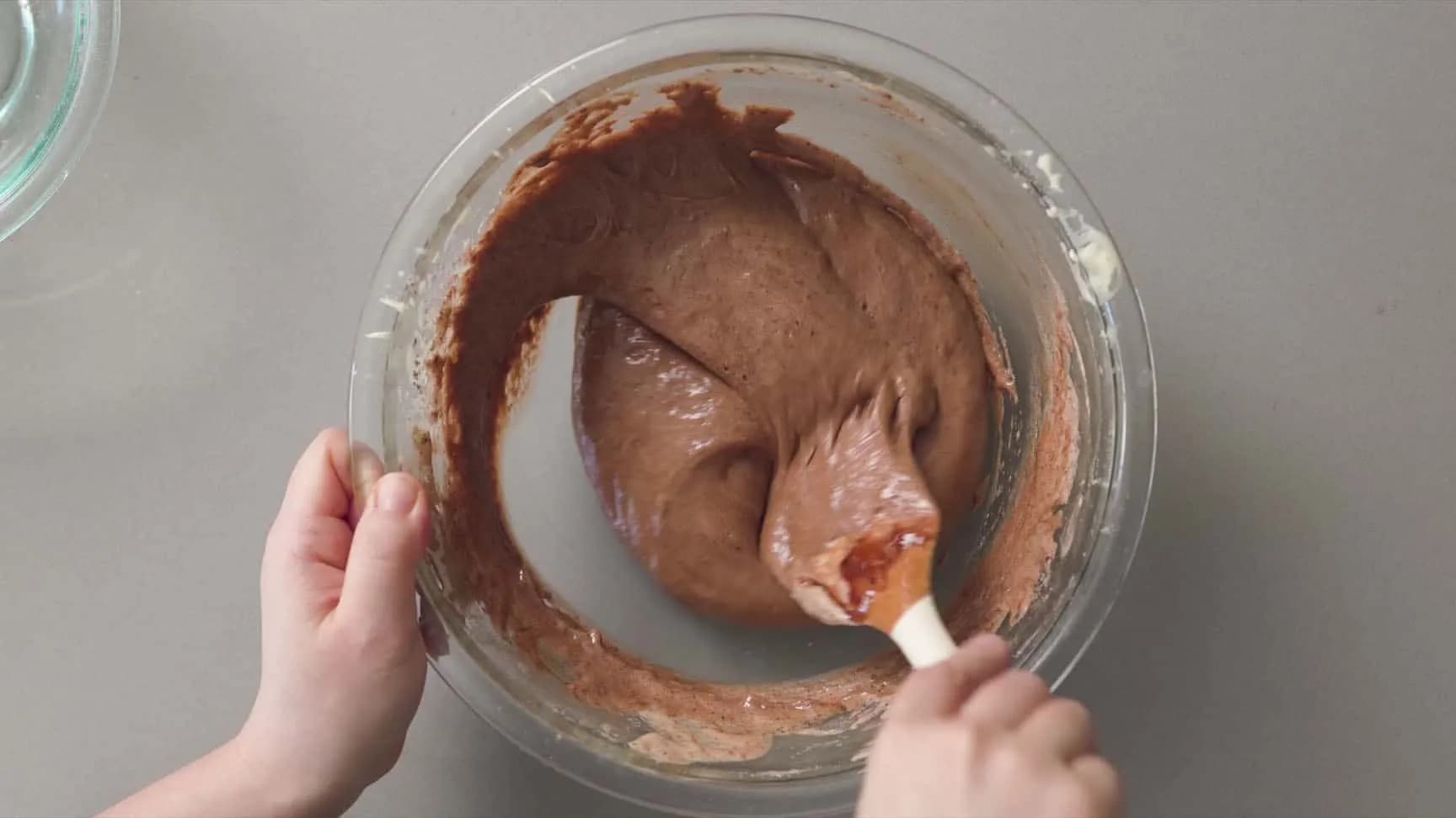 不要等待,紧接着加入融化的巧克力奶油液,整体拌匀。