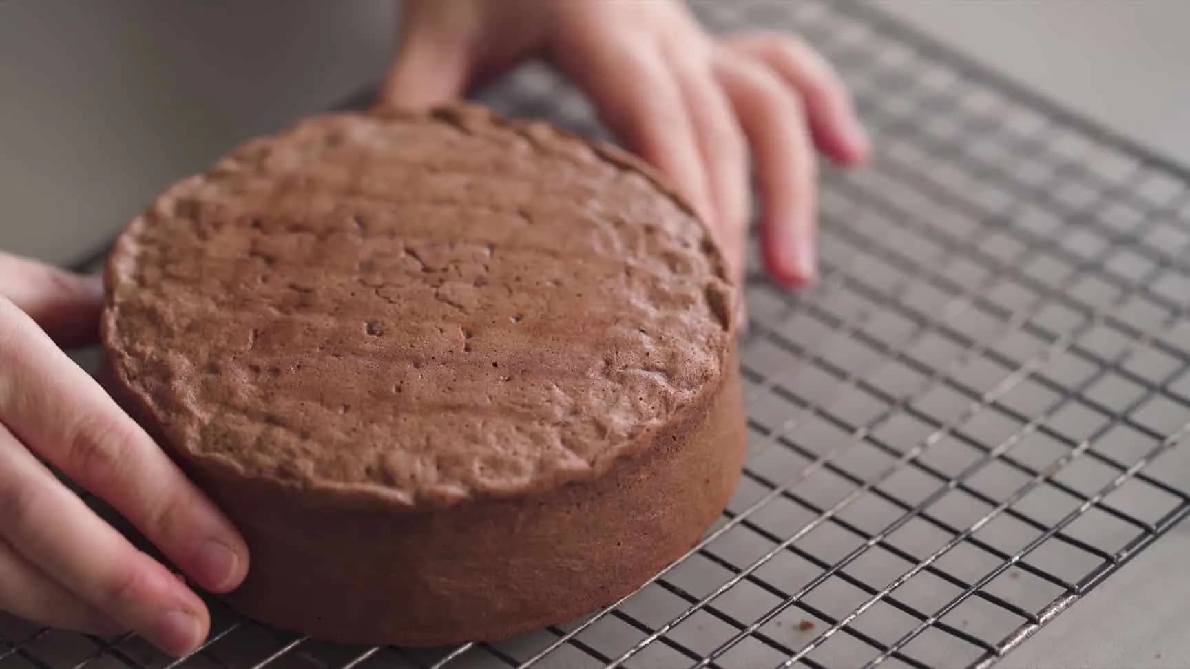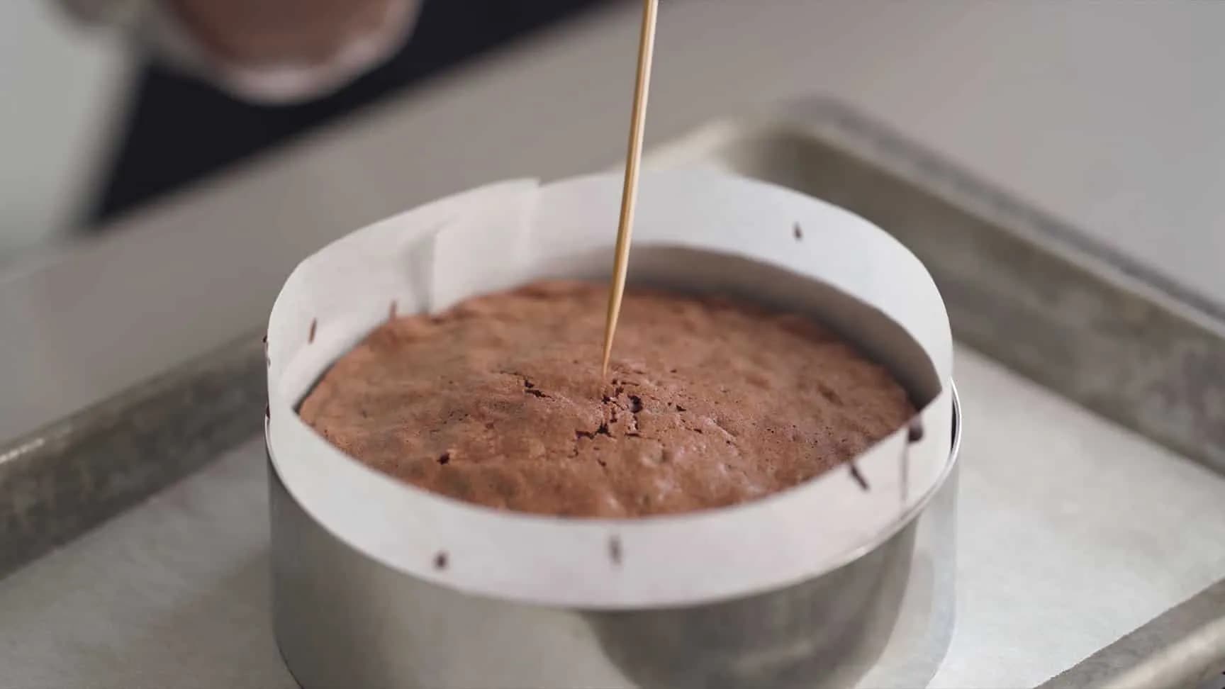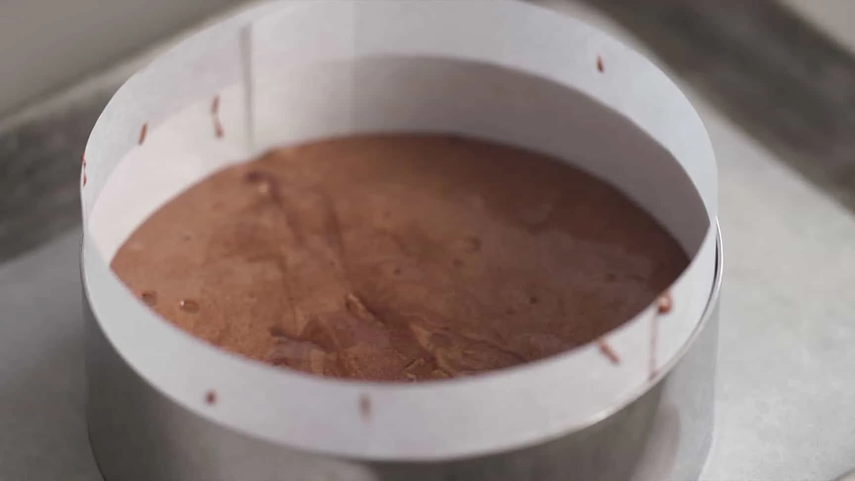 出炉,拿起慕斯圈、撕开侧边的烘焙纸,放凉。