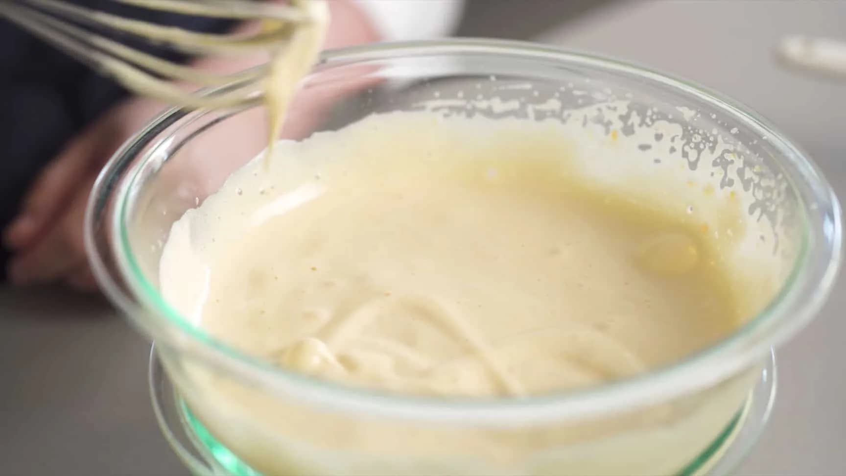 粉类分两次加入,用切拌法轻柔拌匀至看不见残粉后,再加入另一半粉类,整体拌匀,粉类会容易残留在中间底部要留意。
