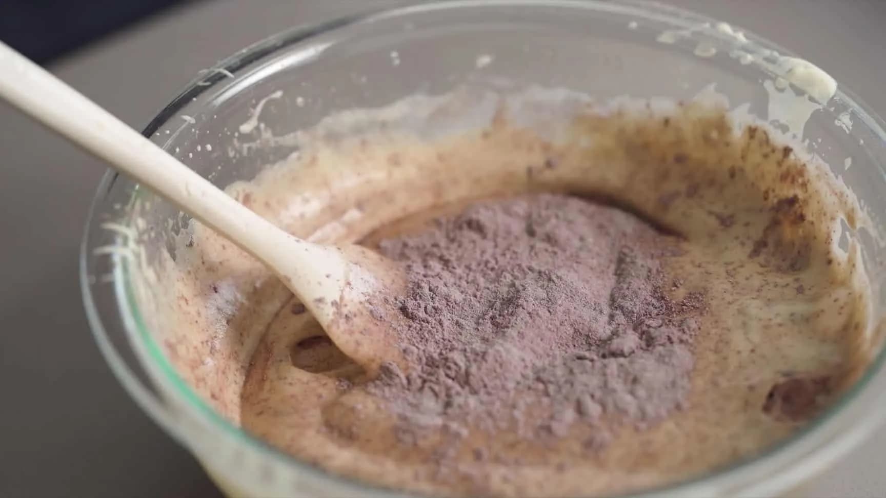 *因为粉类包含油脂(可可粉)加入蛋糊后会开始导致消泡,拌的速度要快、力道要轻。