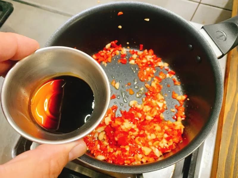 将40克油、蒜头和姜放入炒锅,加入剁椒和豆豉、生抽爆香。