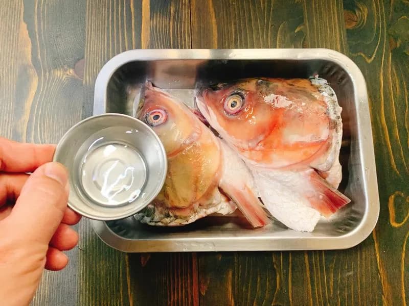 料酒、盐和鱼头拌匀,腌制10分钟,放入蒸锅内备用