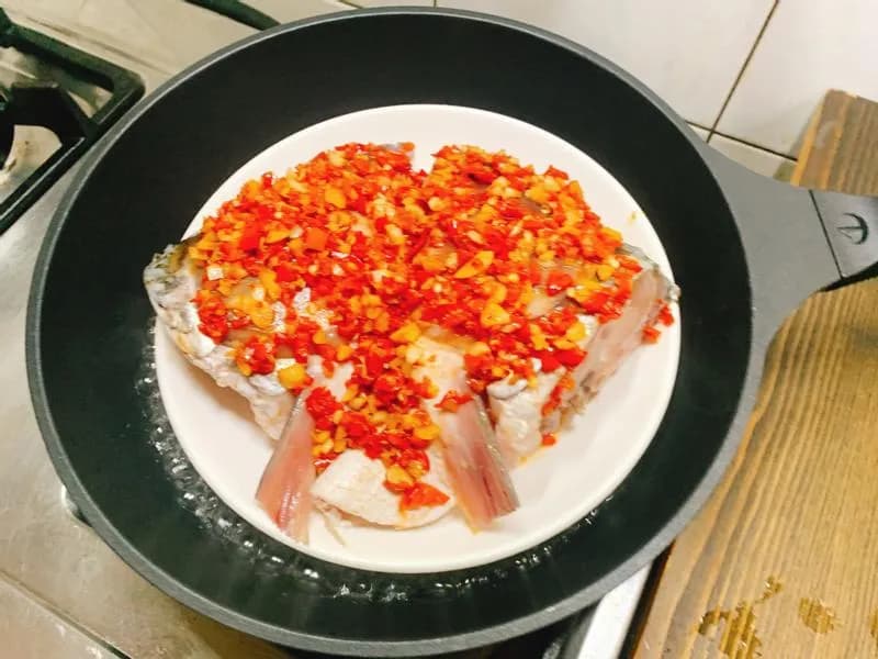 架上蒸锅,蒸锅蒸熟(约15分钟;依鱼头大小增减时间)。