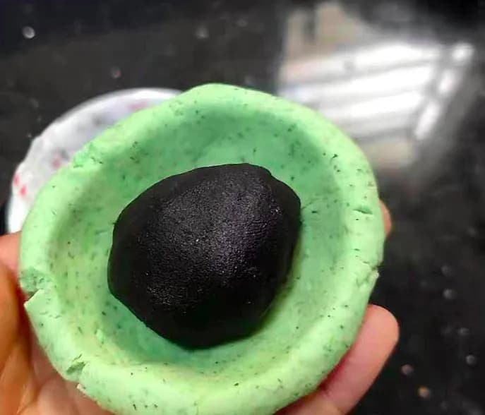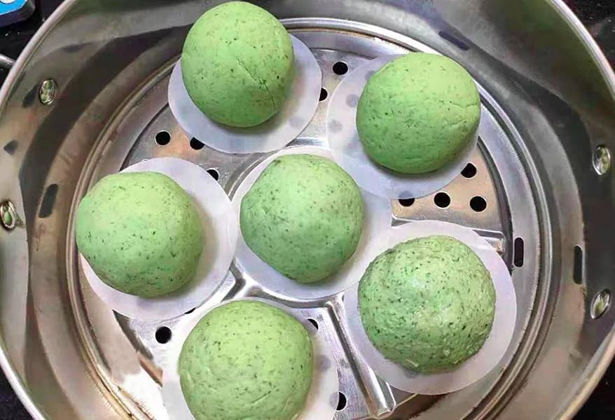 蒸好的艾米果油绿似翠,口感软糯连绵。为了区别不同口味,圆饼蒸熟的大多为芝麻、花生馅的甜馅,也象征着团圆。 -