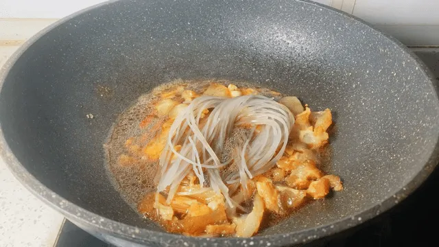 往锅中加入少量的温水,再把泡软的红薯粉条放入锅中,用铲子搅动一下粉条,把锅盖扣上炖20分钟。