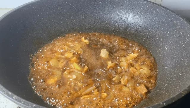 锅中放入适量食用油,把葱姜、蒜、八角、花椒粒同时倒入热油锅中,炒出香味,再把牛蹄筋倒入锅中,先大火不停翻炒几下,把里面的水分炒出来后,再倒入少许酱油、1勺味极鲜、盐和料酒,不停的翻炒,炒至上色。