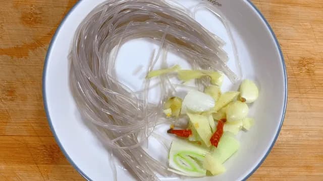 准备适量的红薯粉条,清洗干净后,再次用清水浸泡20分钟,把红薯粉条泡软后可以节省红烧的时间,很容易煮熟。再准备一些炝锅调味品,大蒜、大葱、八角、姜丝。
