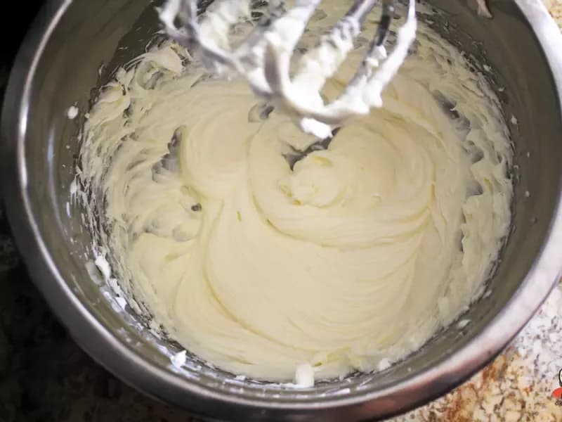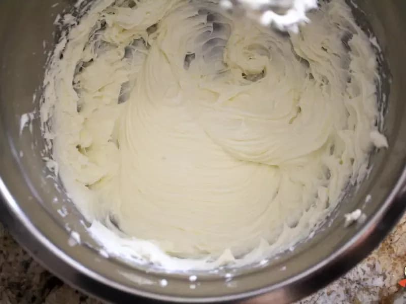 接下来做芝士内馅,在搅拌盆中放入软化的奶油乳酪、糖,搅打至滑顺。