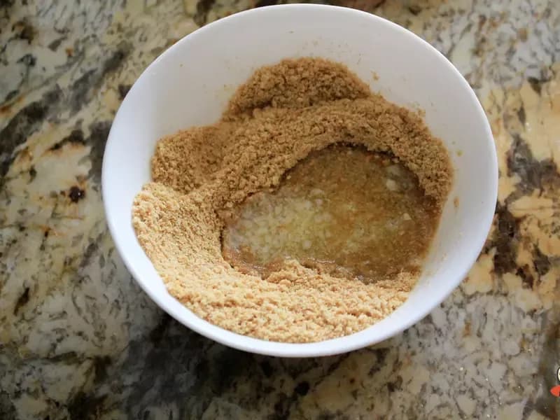融化的芝士倒入饼干碎中混合搅拌均匀。