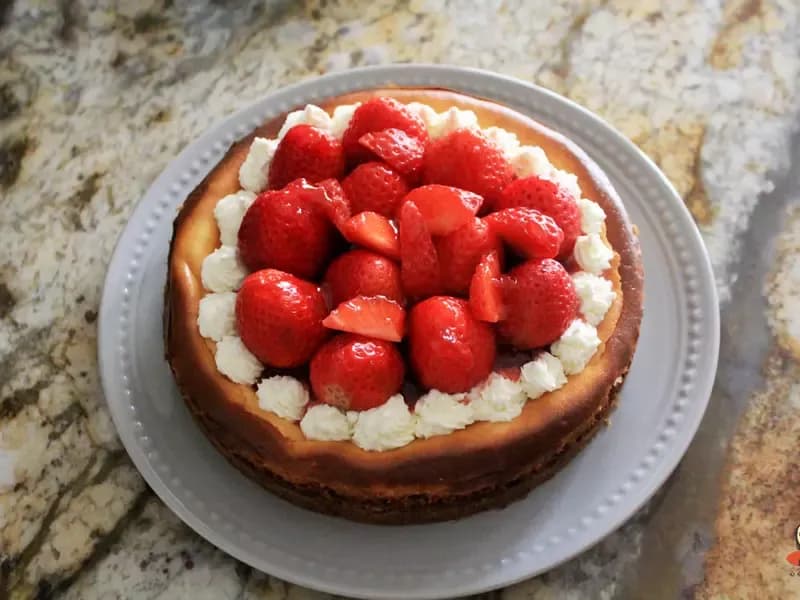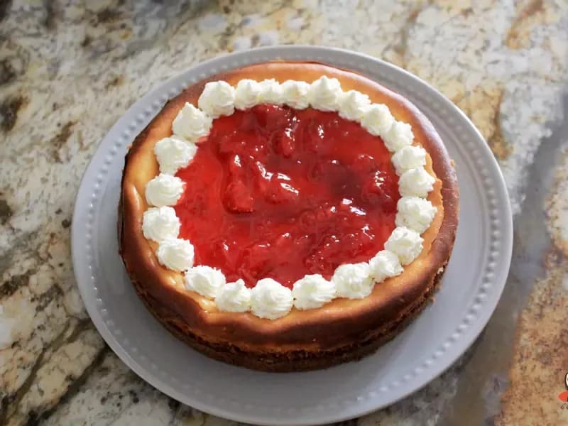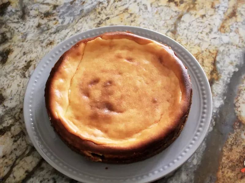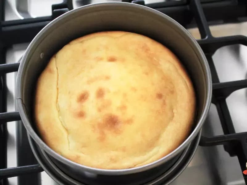 送入烤箱烤40分钟,中心还会有点晃动,关掉烤箱电源后把芝士蛋糕放回去,静置一小时。放凉后送入冰箱冷藏6小时。