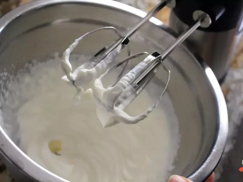 拿一个搅拌盆,加入鲜奶油与糖粉打发到不会流动的状态,约九分发。
