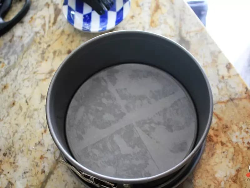 剪一张烤模大小的烘焙纸,先在烤模中刷上奶油然后铺上烘焙纸。
