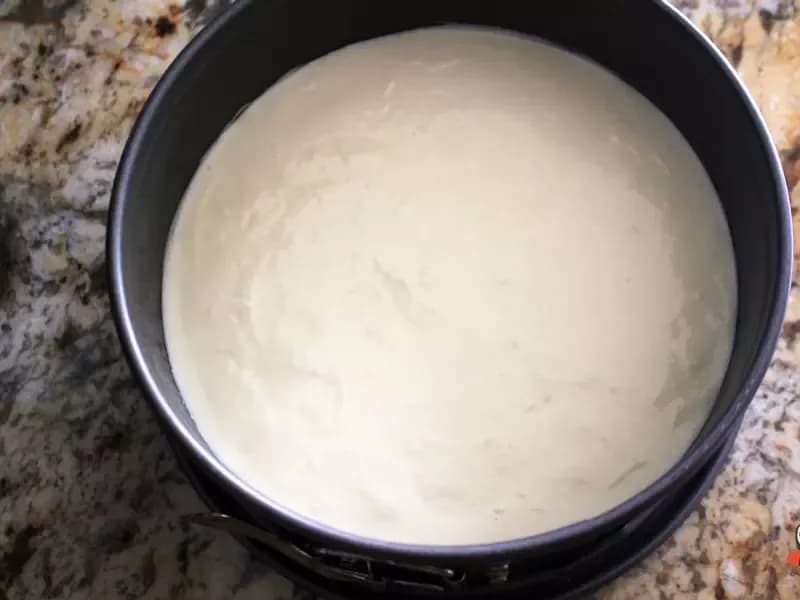 预热烤箱350℉/ 180℃,拿出饼干底,把芝士馅填入蛋糕模,均勻塗開,稍微震一震讓氣泡出來。