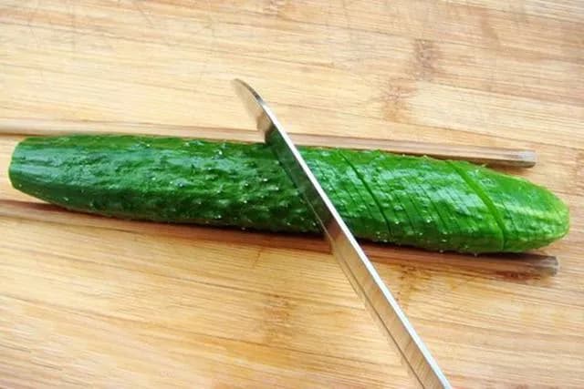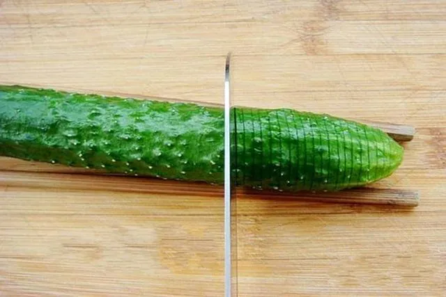 黄瓜放平,两侧分别放一根筷子,目的是每刀不能把黄瓜切断。手持刀具与黄瓜垂直下刀,整根黄瓜连续切成均匀的薄片。这就是直切。