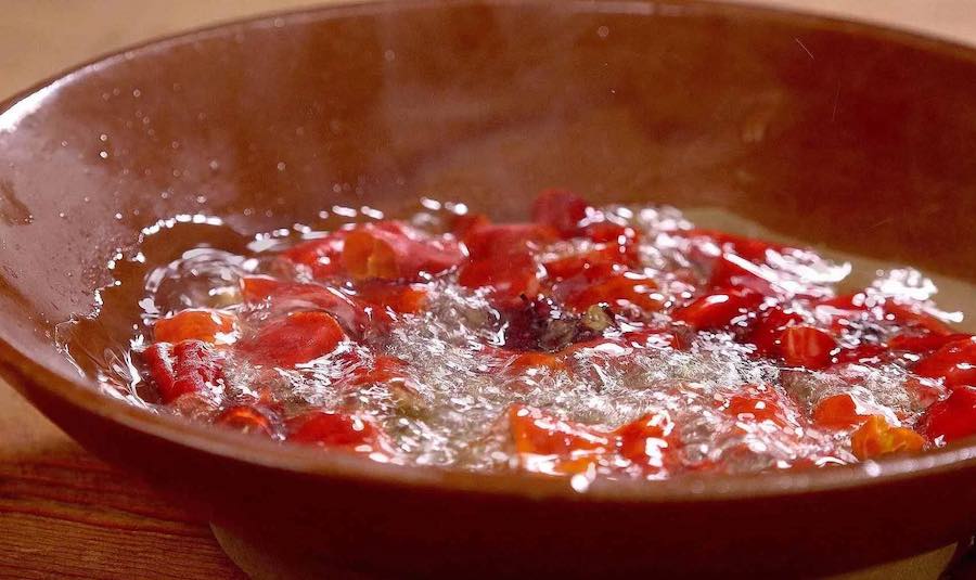 干辣椒、花椒滚油爆香