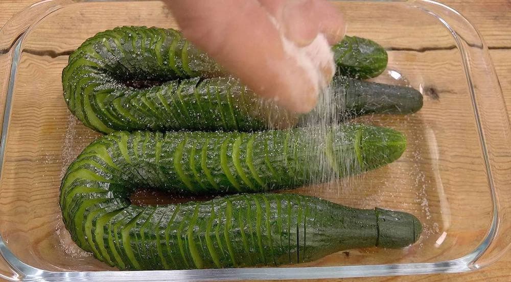 黄瓜切完后放进盆里三上盐,腌制两分钟,将腌出的水倒出。然后装盘加入出辣椒以外准备好的调料,蒜末集中放在顶部。