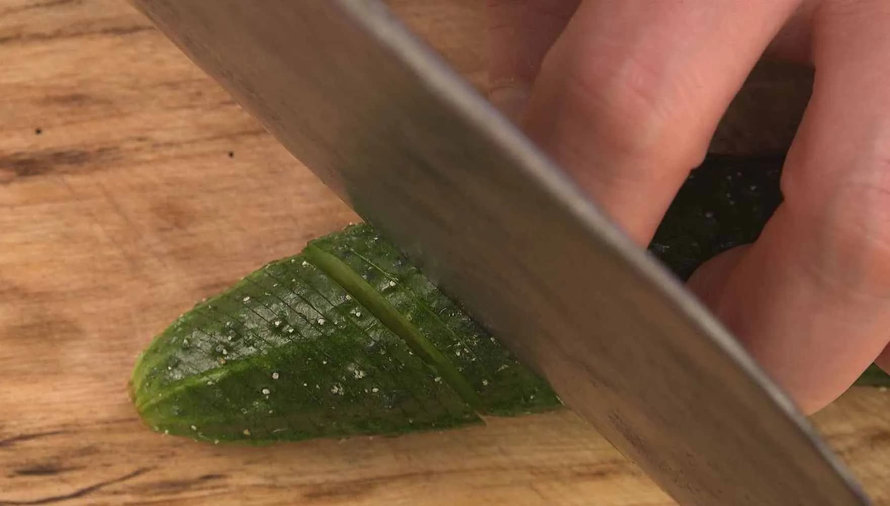 将黄瓜翻转180度,按45度角持刀斜切成均匀的小片。这是斜切。