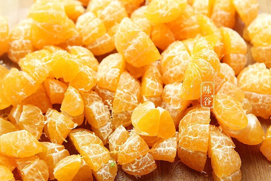 将橘子横着对半切开,挑出果核,撕掉白色筋络,不然也会带有苦味。