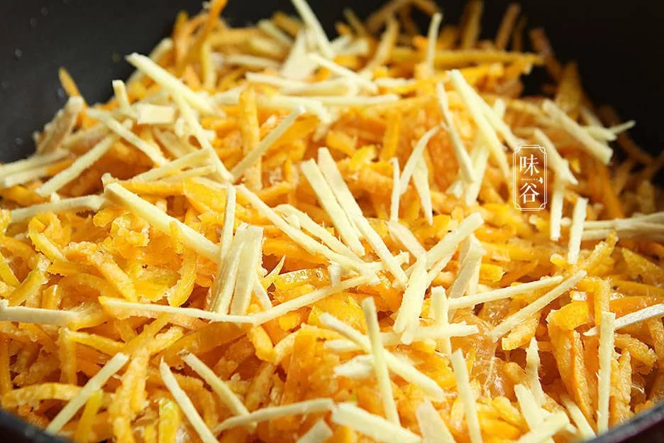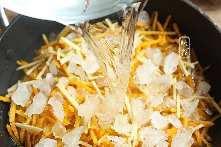 取部分橘子皮浸泡盐水1个小时,然后放入烧开的水中煮3分钟,除掉果皮的苦味,然后捞出来过冷水,然后用小刀把里面白色的瓢刮掉,再把橘子皮切成丝备用。
