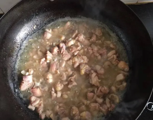 热锅倒油,放鸡腿肉炒,喜欢吃干一点的可以炒久一点。