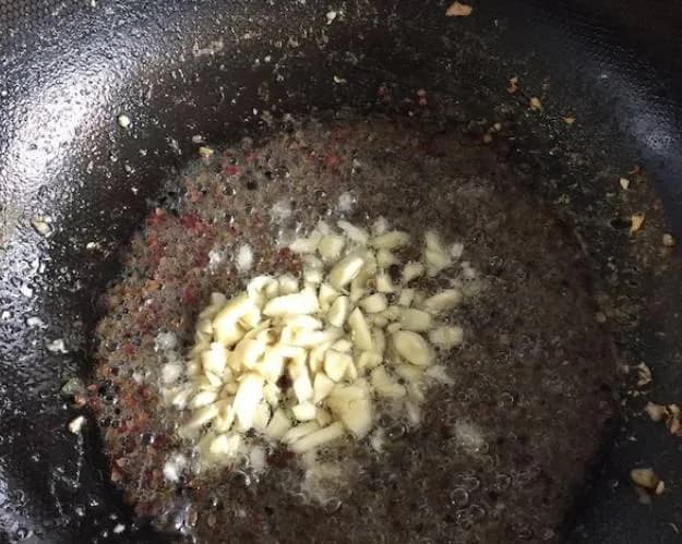 把花椒放进锅里炒香,再放蒜瓣炒香。