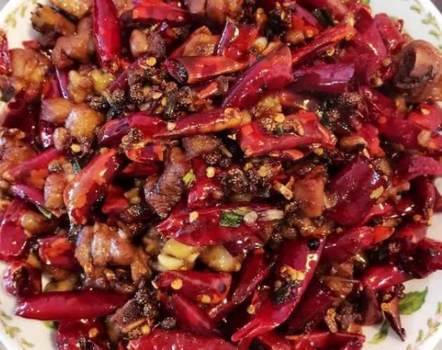 辣子鸡,又名辣子鸡丁,起源于重庆,所以也称重庆辣子鸡或歌乐山辣子鸡,是下河帮川菜的辣子系列代表。特点是麻辣中透着鲜香。鸡块外焦里嫩,麻辣爽口。装盘时一般将葱姜挑出,并掺杂炸好的米饼做点缀。 做辣子鸡最好是用鸡腿肉,其肉质更适合做这道美味的菜肴。而且鸡腿肉更有嚼劲儿。做得时候,也要控制好油温,辣椒不要炸得太焦。最好辣椒的数量盖过鸡肉的数量,这样做出来的味道才更正宗。而且,做好辣子鸡后,小编建议在鸡肉上撒上熟芝麻或配一点花生米,这样味道会更好哦!